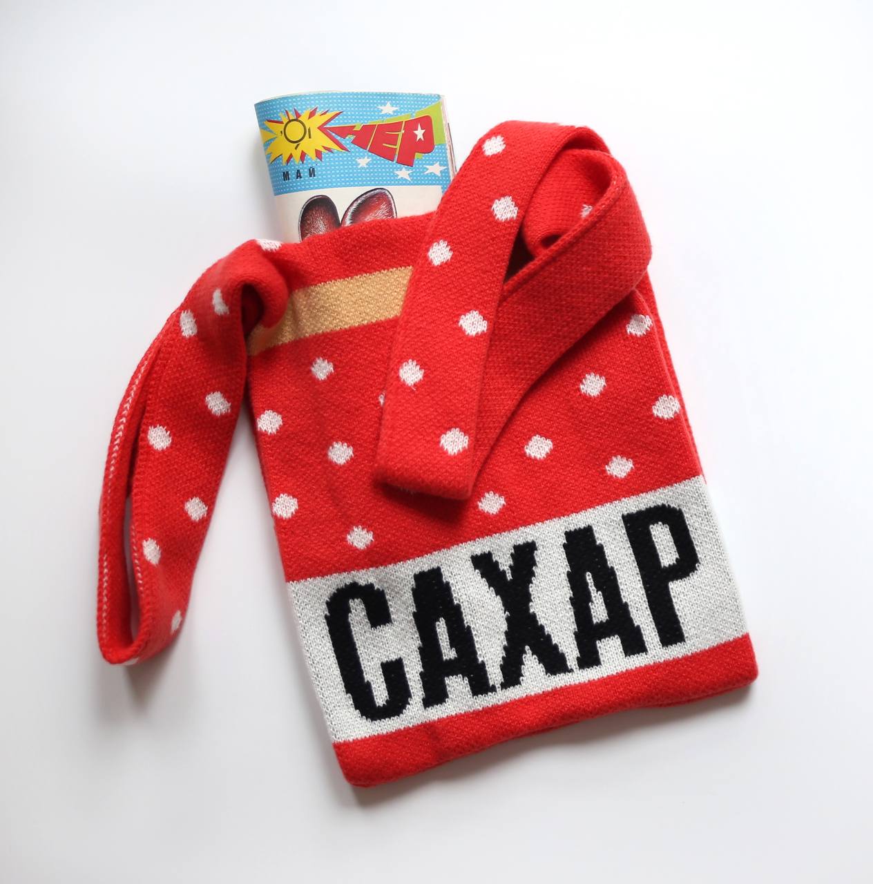 Приз – вязаная сумка-шопер «Сахар» от ломовейшего бренда одежды и аксессуаров Привет Мишка, напоминающая о бабушкиной кухне, где рис, манка и сахар хранились в милых баночках в горошек.